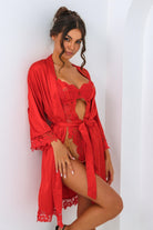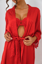The Regina Bodysuit stuns with its intricate lace, delicate mesh, and bold chain and strap detailing — designed to sculpt, seduce, and empower. Layer it with the flowing satin luxury of our lace-trimmed robe, finished with a flattering waist tie and soft, breathable fabric for all-day comfort.